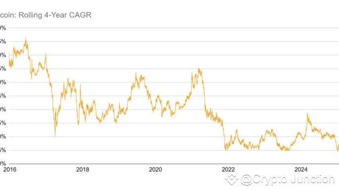 Bitcoin’s four-year compound annual growth rate (CAGR) has dropped to its lowest point ever, now at 14.45%.