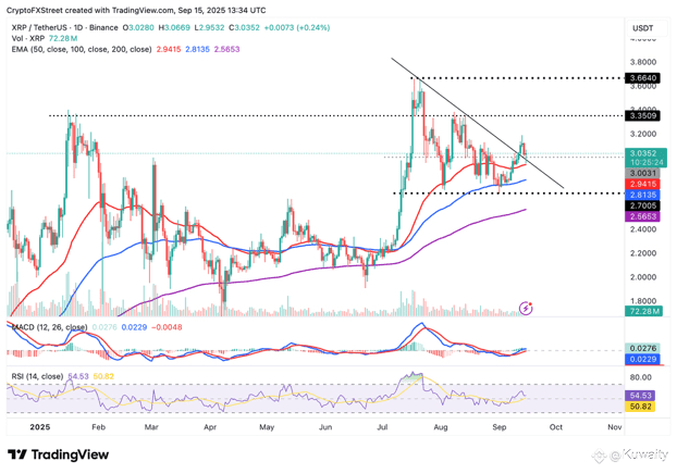 يتداول $XRP حول المستوى الحرج 3.00 دولارات يوم الاثنين، منخفضًا من أعلى مستوى خلال اليوم عند 3.06 دولارات. يظهر الرسم البياني اليومي أدناه دعم خط الاتجاه الهابط حول نفس المستوى، مما يزيد من احتمال حدوث ارتداد.