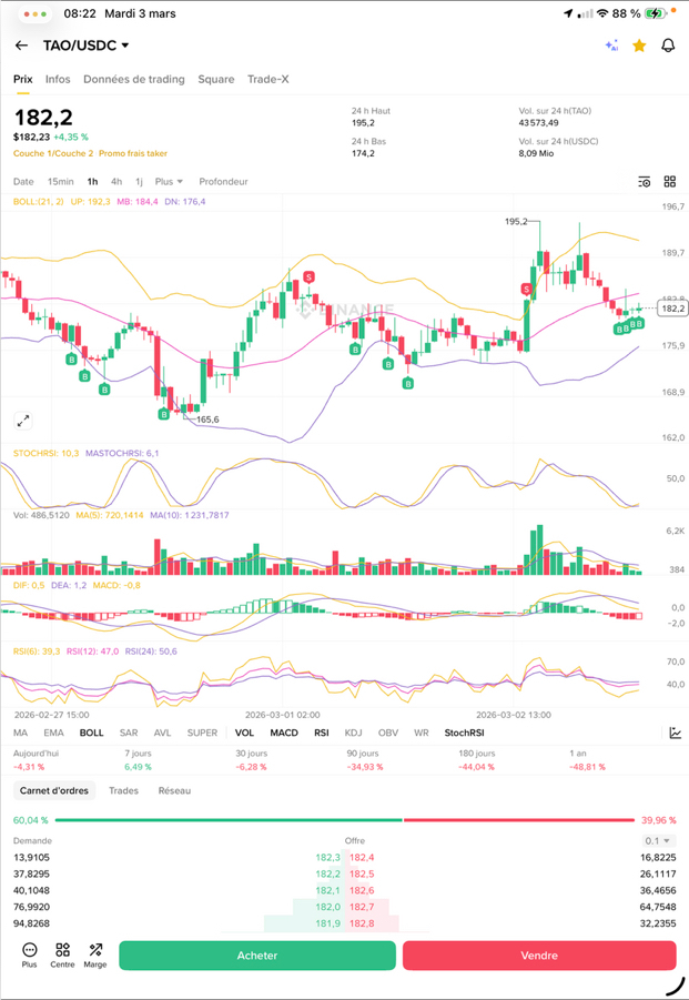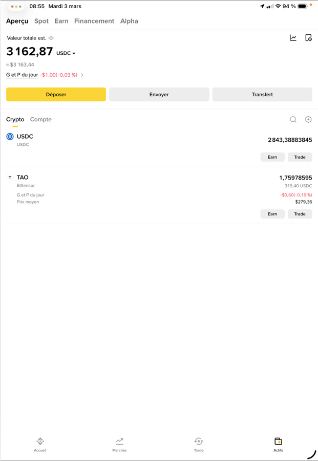 J’ai environ ±319 USDC flottants entre TAO et USDC.