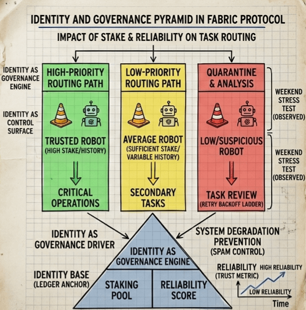 In Fabric, when a robot submits a result, its identity signs the work. Validators aren't just checking math; they are scoring reliability. Low-scoring identities get pushed to the back of the line.