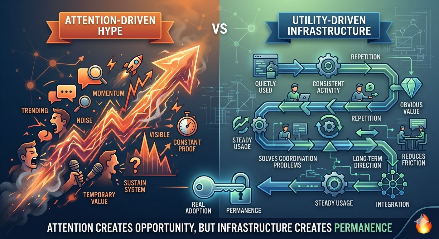 So the real question is no longer what is gaining attention today. The real question is what will still be used when attention moves somewhere else. Because that is where durability is built. Systems that rely on excitement eventually slow down but systems that rely on utility continue to grow, even when no one is watching closely.