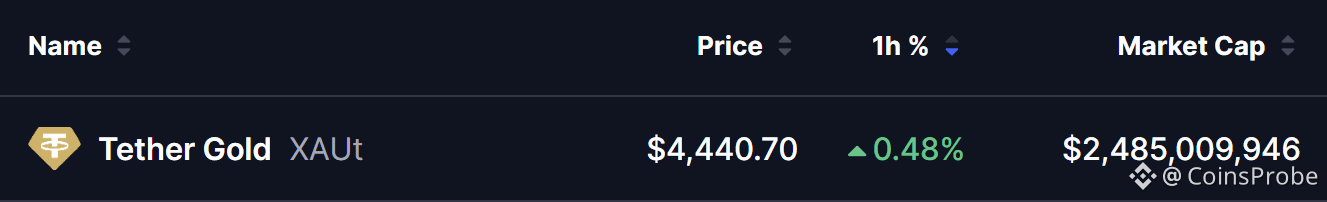 $XAUt is currently trading at $4,440.70 (+0.48% in the past hour) with a market capitalization of approximately $2.485 billion — making it the largest tokenized gold asset in the cryptocurrency market.