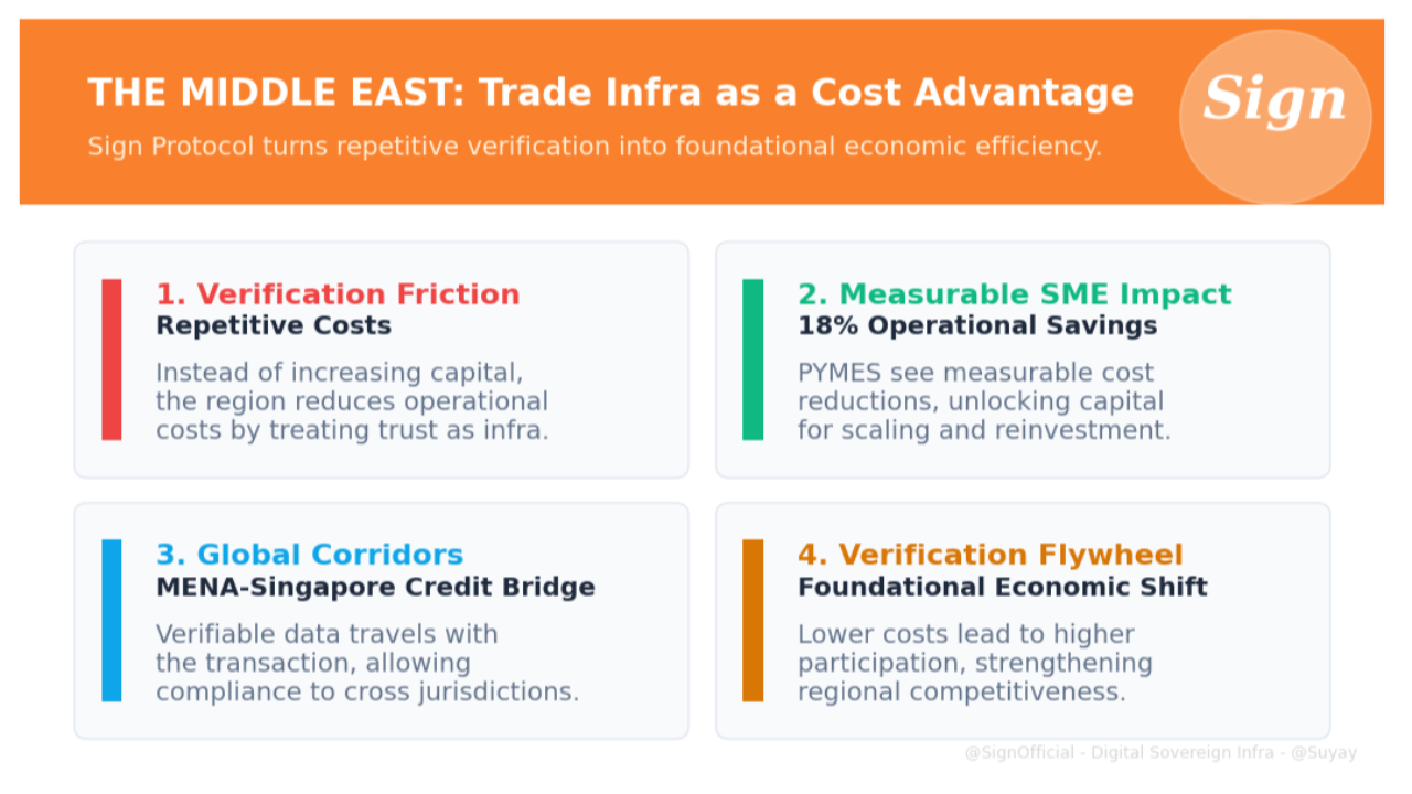At the center of this shift is a simple but powerful change in how systems handle trust. Instead of treating verification as a repetitive process, it is being treated as infrastructure. A shared layer where claims can be issued, verified, and reused across institutions without losing integrity or control. This is where protocols like Sign become structurally important. Not as tools operating on top of the system, but as part of the foundation that allows data to carry proof across environments. Once that layer is in place, the effects compound quickly. Lower costs lead to higher participation, higher participation increases data reliability, and stronger data reliability reinforces the infrastructure itself. Over time, the competitive advantage is no longer defined by access to capital alone, but by how efficiently that capital can move through systems that already trust what they process. The Middle East is one of the first regions where this transition is happening in real time, and the fact that its impact is already measurable suggests that the shift is no longer theoretical. It is operational.
