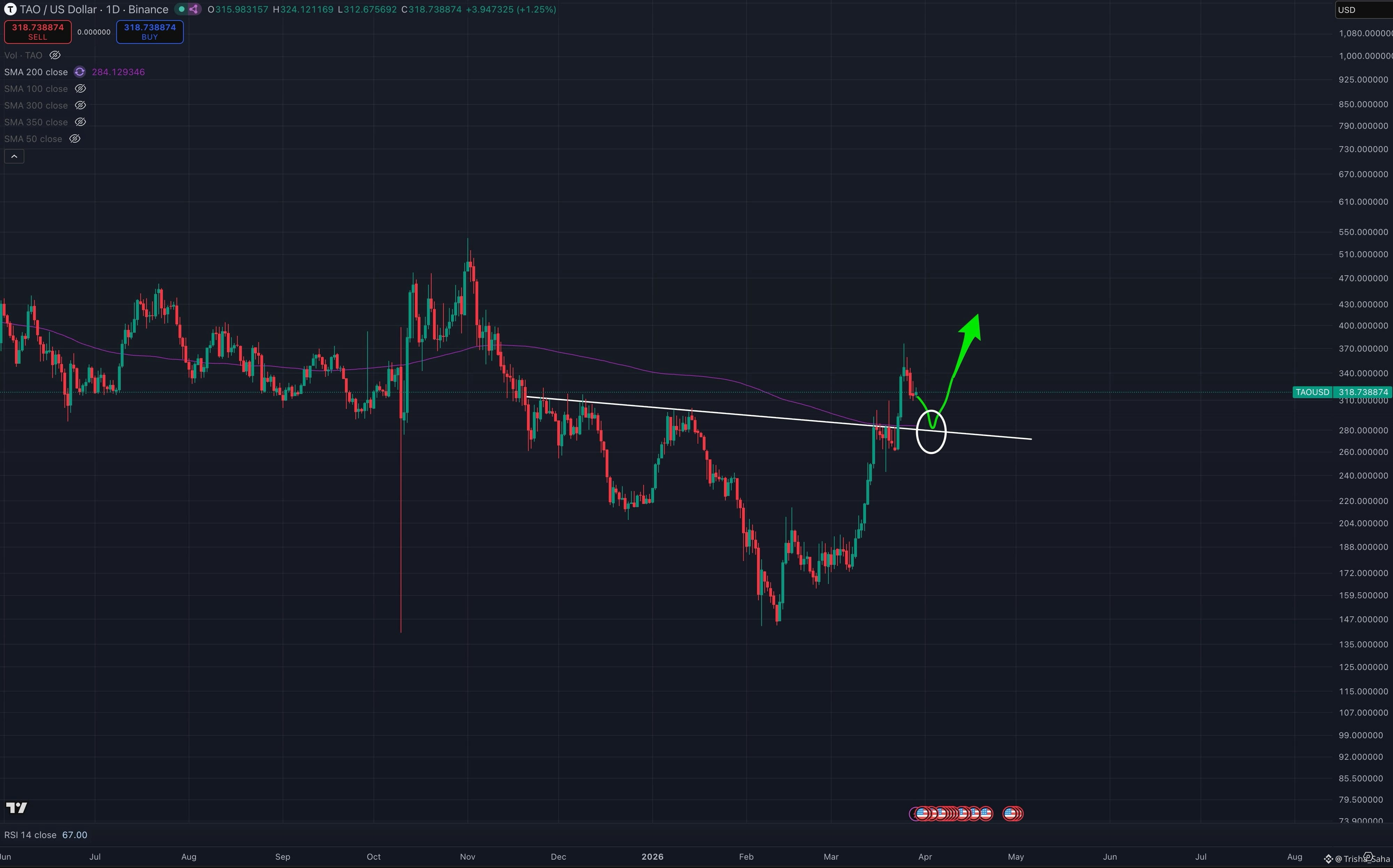 السعر حالياً يتداول عند 318.73$، محاولاً الاستقرار فوق مستويات المقاومة السابقة.