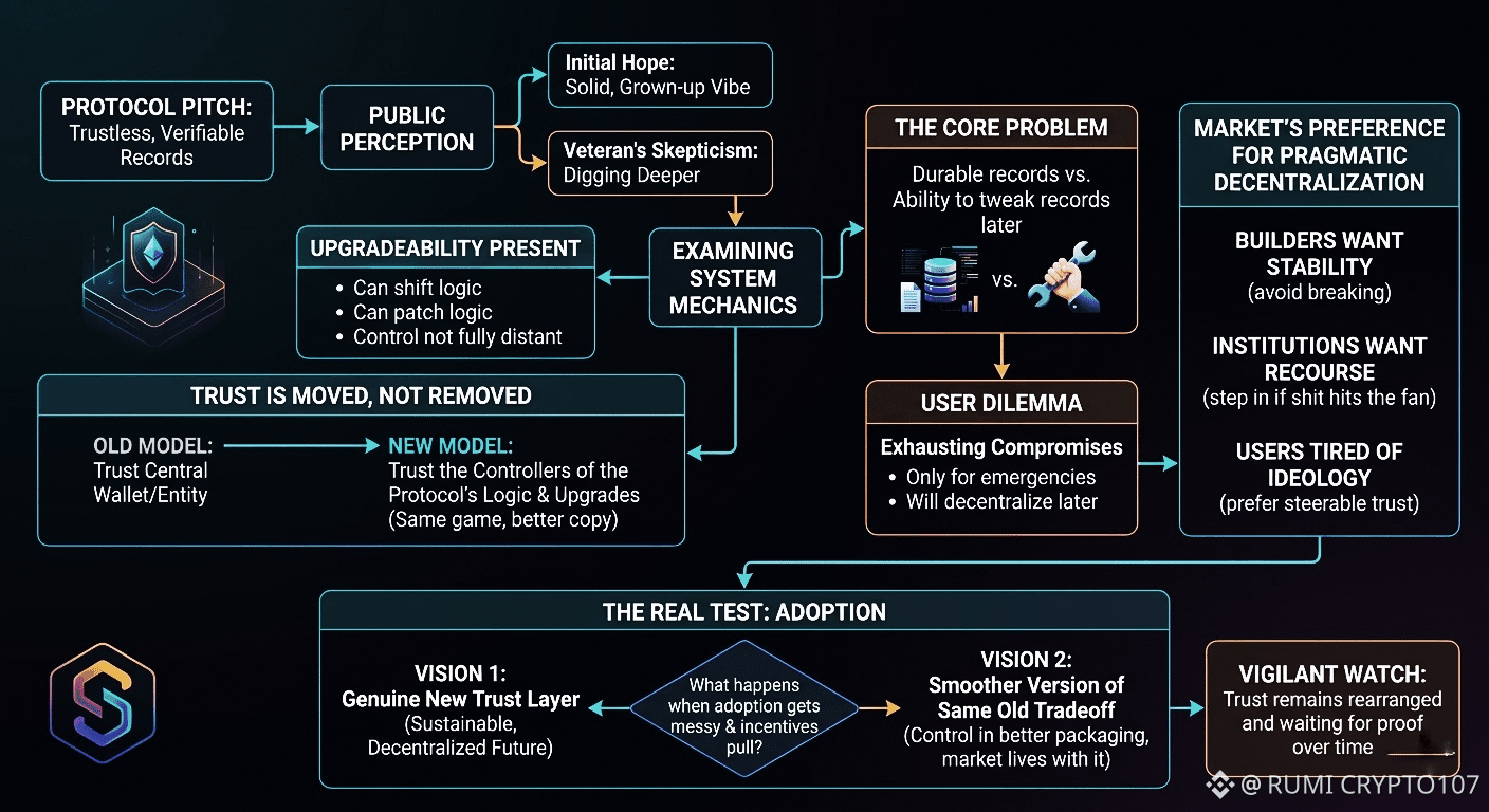 We all hear the word “protocol” and picture something rock-solid, almost untouchable. Code that follows rules instead of whoever happens to hold the keys this week. That dream has been around forever in crypto, even after we’ve gotten burned enough times to know better. Sign talks a great game about trust and verification, but when you dig into how it actually works, the upgradeability is still right there. The rails can shift. The logic can get patched. The hand on the wheel never fully steps away.