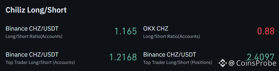 The most significant data point is the Binance Top Trader Long/Short Positions ratio of 2.4097 — meaning professional traders on Binance are positioned more than 2.4:1 long versus short on CHZ. This is not general retail sentiment — this is the most sophisticated trading cohort on the world’s largest exchange actively positioning for upside.