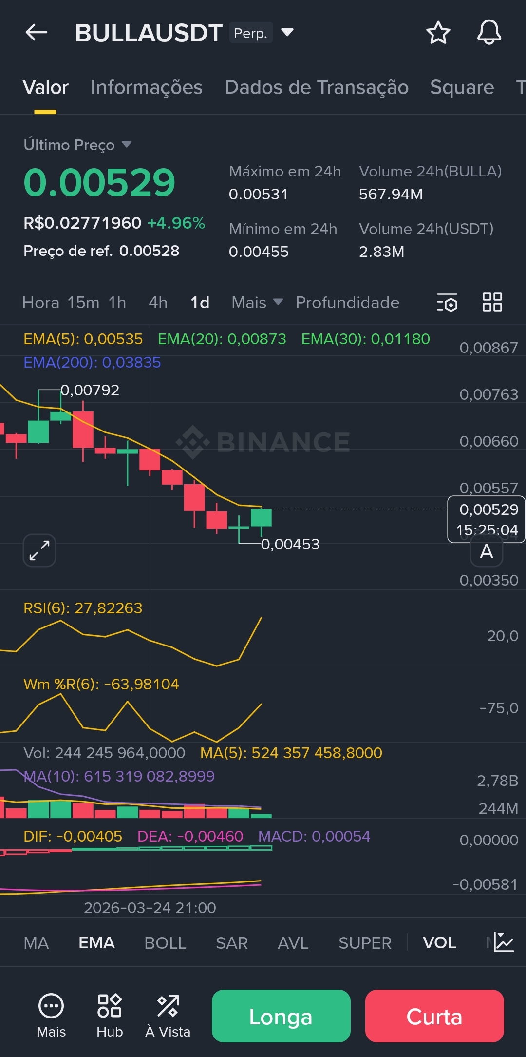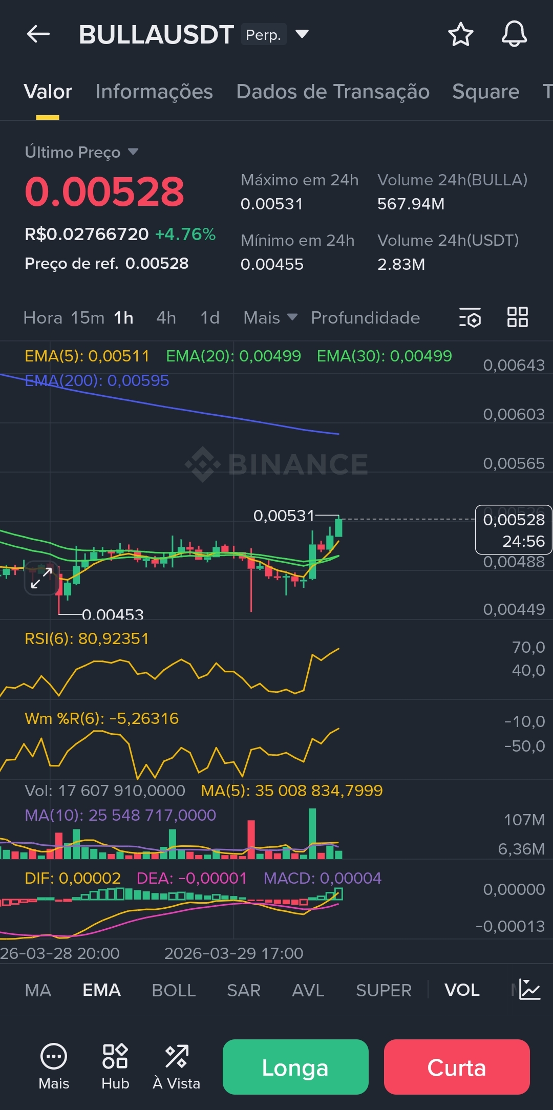 O preço rompeu as médias curtas (EMA 5, 20, 30) com um Candle de Força. No entanto, o RSI(6) em 83,48 sugere exaustão compradora iminente. O preço atingiu a máxima de 24h em 0,00531 e recuou levemente, encontrando resistência exatamente nesse topo anterior.
