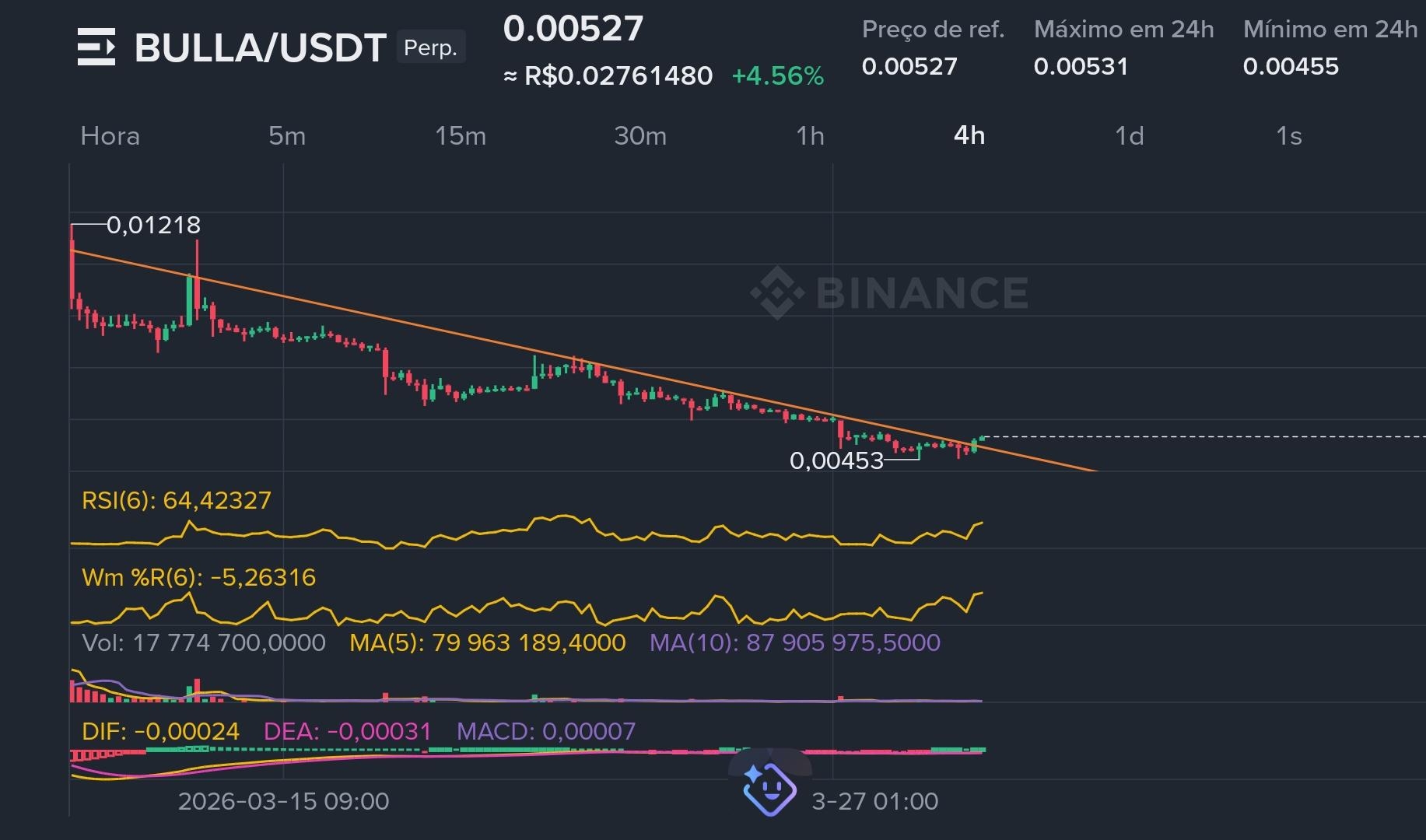 * 4H: Observamos uma tentativa de reversão com a formação de candles de corpo pequeno próximos ao fundo de 0,00453. O RSI subiu para 64,84, mostrando entrada de força compradora no curto prazo.