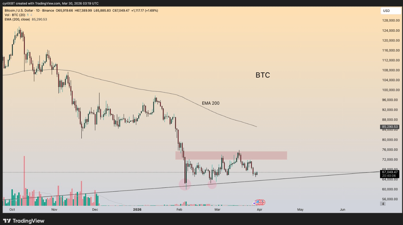 $BTC Bitcoin is attempting a rebound near $67K but remains capped below the $72K–$76K resistance zone, with the 200-day EMA at $85K still far out of reach.