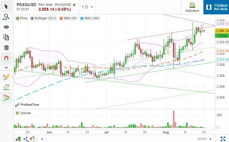 PAX Gold (PAXG) is a gold-backed digital asset where each token represents 1 fine troy ounce of physical gold. Its price closely tracks real-world gold, making it more stable than typical cryptocurrencies.