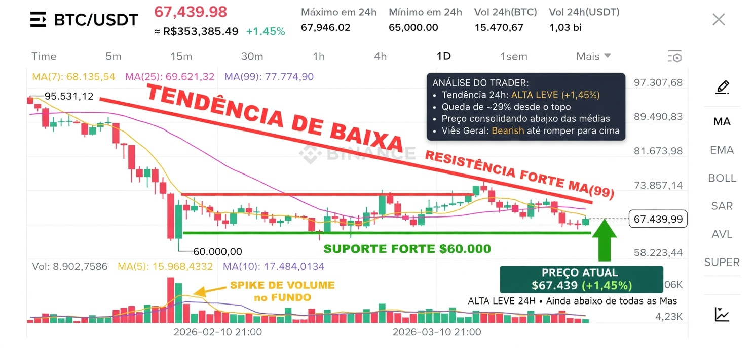 Preço subiu de 65.000 pra 67.439 (+1,45% nas últimas 24h), mas continua abaixo de TODAS as médias móveis (MA7 68.135, MA25 69.621 e MA99 77.774).