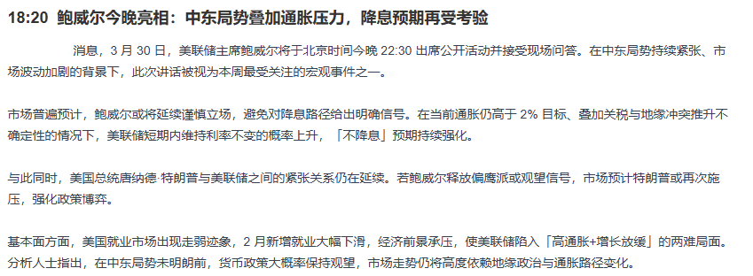 中东局势升级+通胀死咬2%+就业崩盘,美联储最怕的是“滞胀”。鲍威尔今晚必须比市场预期更鹰,才能压住通胀。