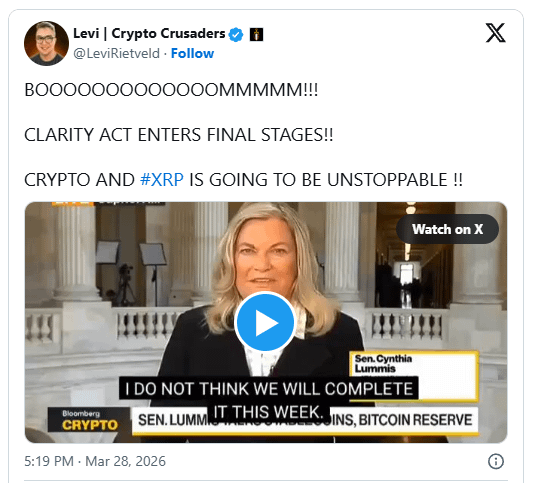 Crypto Crusaders founder Levi Rietveld shared a clip from a Bloomberg interview where Senator Cynthia Lummis explained where the bill stands.