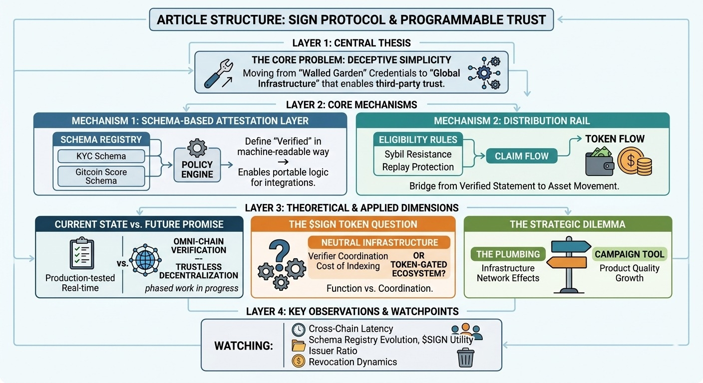 i was digging through the SIGN documentation again, and it’s one of those projects that feels deceptively simple until you start mapping out the operational dependencies. you’ve got schemas for attestations, a way to map those to identities, and a distribution engine to handle token claims. the surface-level narrative is basically just "airdrops but structured," or "credentials for web3 growth." and honestly, that’s useful enough. but it’s not really the full picture.