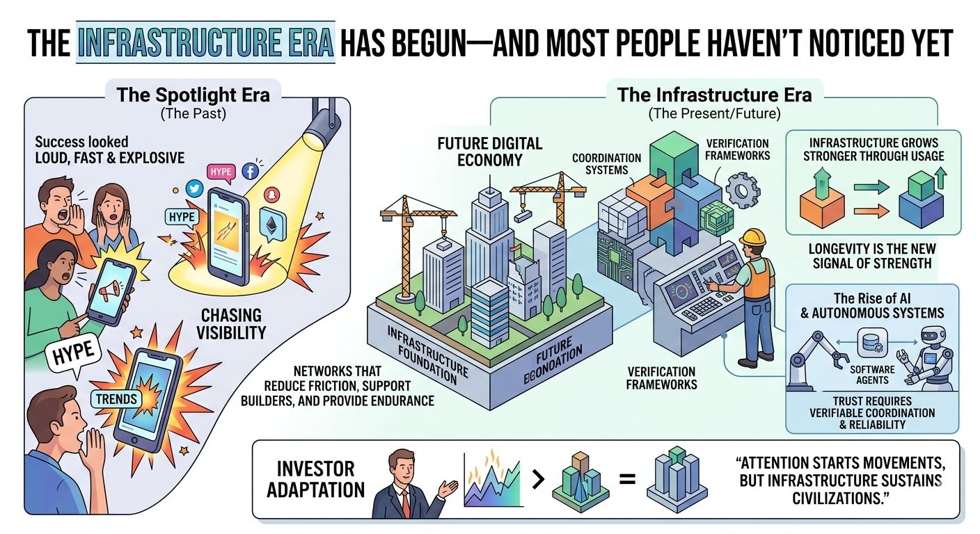 For years the crypto market moved like a spotlight. Attention decided everything. Projects that dominated conversations felt unstoppable while quieter builders remained invisible. Success looked loud, fast and explosive. But something subtle has started to change and many participants still have not realized it.The market is no longer rewarding noise alone. A deeper transition is unfolding beneath price charts and daily trends. Instead of chasing visibility serious builders are focusing on systems that continue operating even when attention disappears. This shift marks the beginning of what could become the infrastructure era of the digital economy