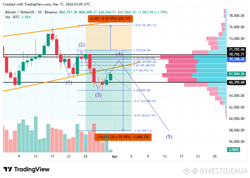 Оценка вероятности шорт-сценария по BTCUSDT (обновление на 31.03.2026, 1D-график + актуальные рыночные данные)