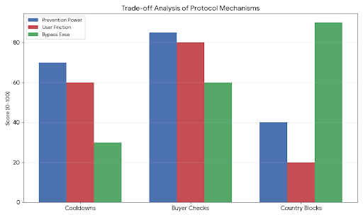 There’s also the issue of timing. No rule is enforced instantly. There’s always a gap between action and reaction. Cooldowns help by limiting how fast something can repeat, but they don’t stop the first move. Buyer checks depend on information that may already be outdated. Country blocks rely on signals that can be altered in real time.