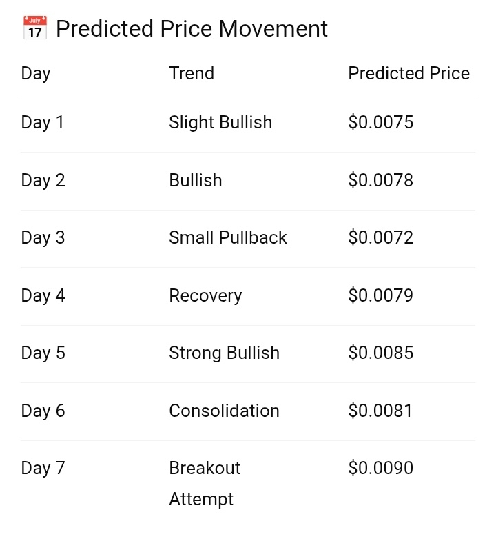 DayPredictionPrice RangeDay 1Slight Bullish$0.0060 — $0.0065Day 2Bullish$0.0063 — $0.0070Day 3Pullback$0.0058 — $0.0065Day 4Breakout Attempt$0.0065 — $0.0075Day 5Strong Bullish$0.0070 — $0.0085Day 6Consolidation$0.0068 — $0.0080Day 7Trend Decision$0.0075 — $0.0090