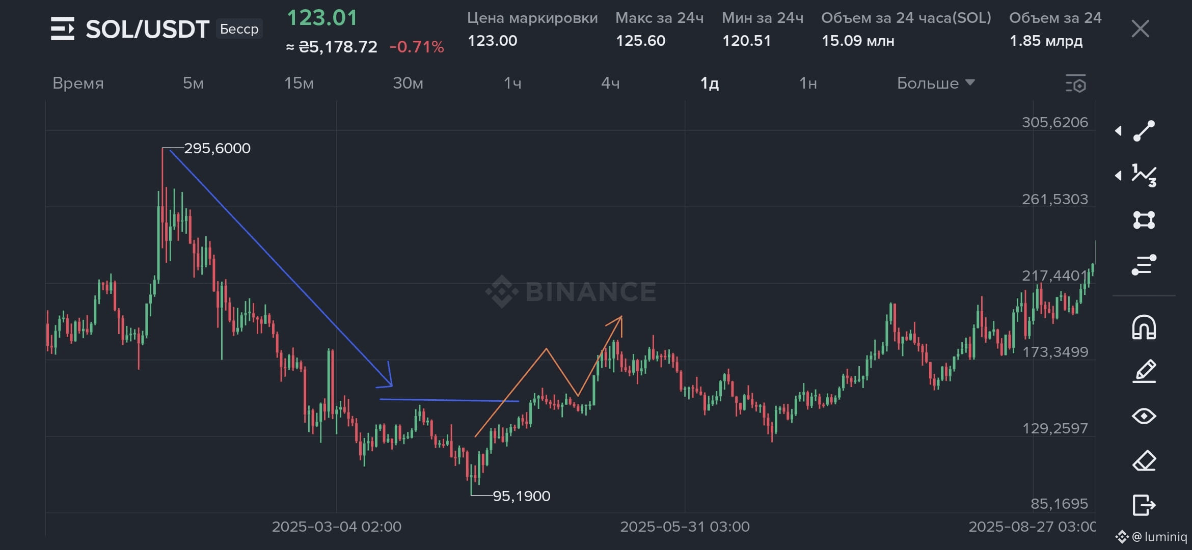 2. Рынок делает небольшой откат против нового тренда (оранжевый), а затем обновляет максимум уже нового движения