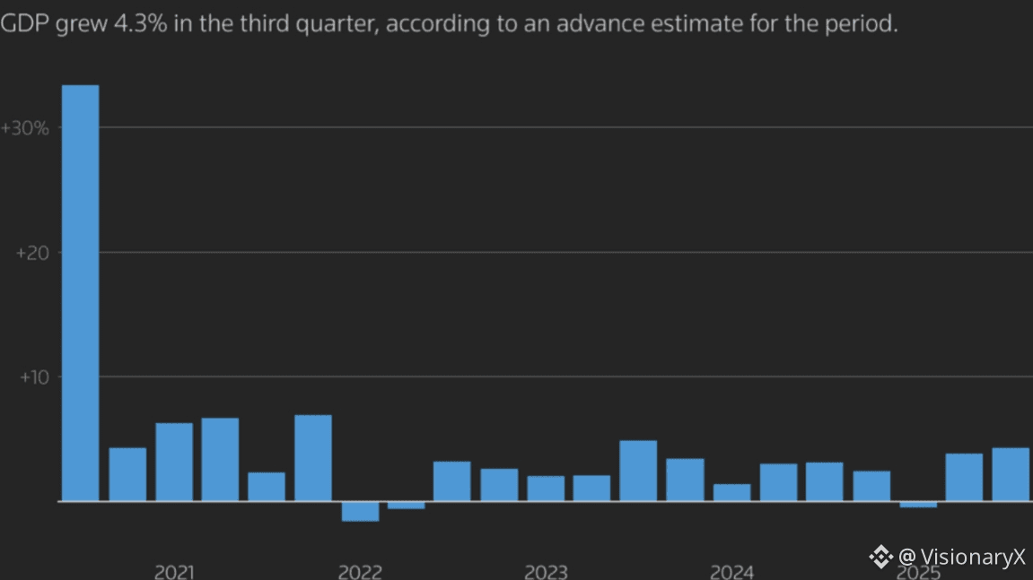 The U.S. economy grew at an annualized 4.3% rate in Q3 2025, well above the roughly 3.3% consensus. The report attributes this surge to a jump in consumer spending (+3.5%, the fastest pace in over a year) along with higher exports and government outlays. A smaller trade deficit (exports up, imports down) added about 1.6 percentage points to growth even as private investment (inventories) waned. Inflationary pressures are evident – the GDP price index rose about 3.4% (personal consumption deflator +2.8%, core PCE +2.9%), underscoring that prices remain elevated.