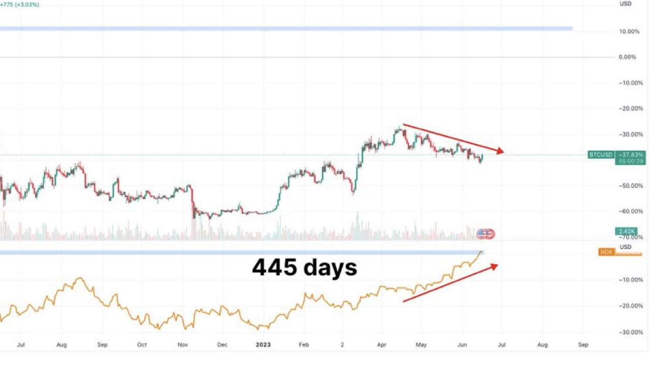 Инвестор, который правильно спрогнозировал достижение криптодна 2022 года, считает, что крипторынок, вероятно, готовится пойти по стопам бычьего фондового рынка. Партнёр венчурной компании Placeholder Крис Берниске сделал наблюдение о том, что криптовалюты часто растут, когда индекс Nasdaq 100 (NDX) делает передышку. Он сослался на данные основателей Glassnode Яна Хаппеля и Яна Аллеманна, которые отметили, что с 2019 года биткоин (BTC) показывал сильный рост после того, как NDX затормаживался. Хаппель и Аллеманн написал, что в мае 2019 года биткоин превзошёл NDX после того, как индекс показал признаки бычьего истощения. Соучредители Glassnode добавили, что похожий случай был в 2020 году. По словам Аллеманна и Хаппеля, сейчас биткоин в нескольких сантиметрах от того, чтобы снова превзойти NDX, поскольку индекс близок к отметке локального максимума.#BTC #NDX