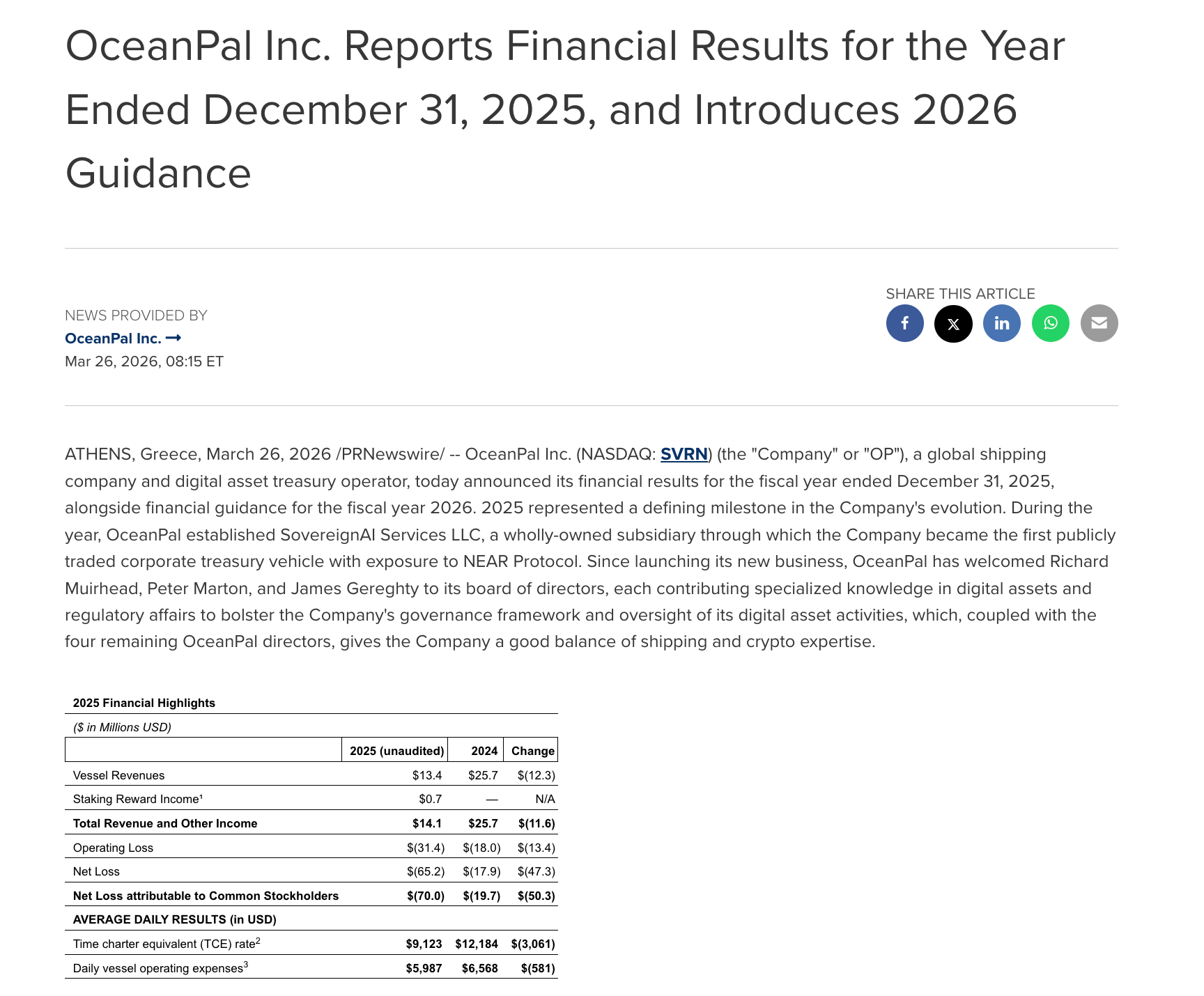 Previously, OceanPal announced in October last year a collaboration with the NEAR Foundation for a $120 million PIPE investment, leading to the establishment of a wholly-owned subsidiary, SovereignAI Services. This subsidiary is projected to have total assets of around $85.5 million by December 31, 2025.