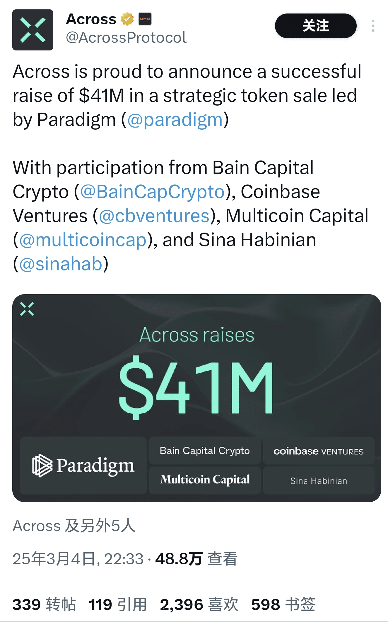At the same time, Across is the first intention interface launched by OP Superchain, which brings more possibilities to the potential use cases of the protocol, that is, a new narrative, L2 interactive narrative. On March 4, 2025, the protocol received a $41 million investment led by Paradigm.