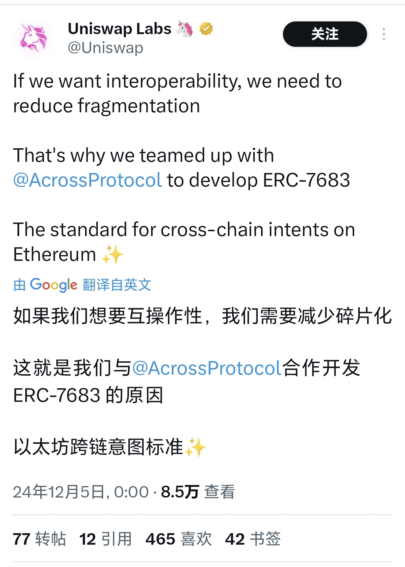 Across is a new project based on ERC-7683, backed by the DeFi leader Uniswap. It is currently a cross-chain protocol integrated on the uniswap front end, which can be said to be making money while doing nothing.