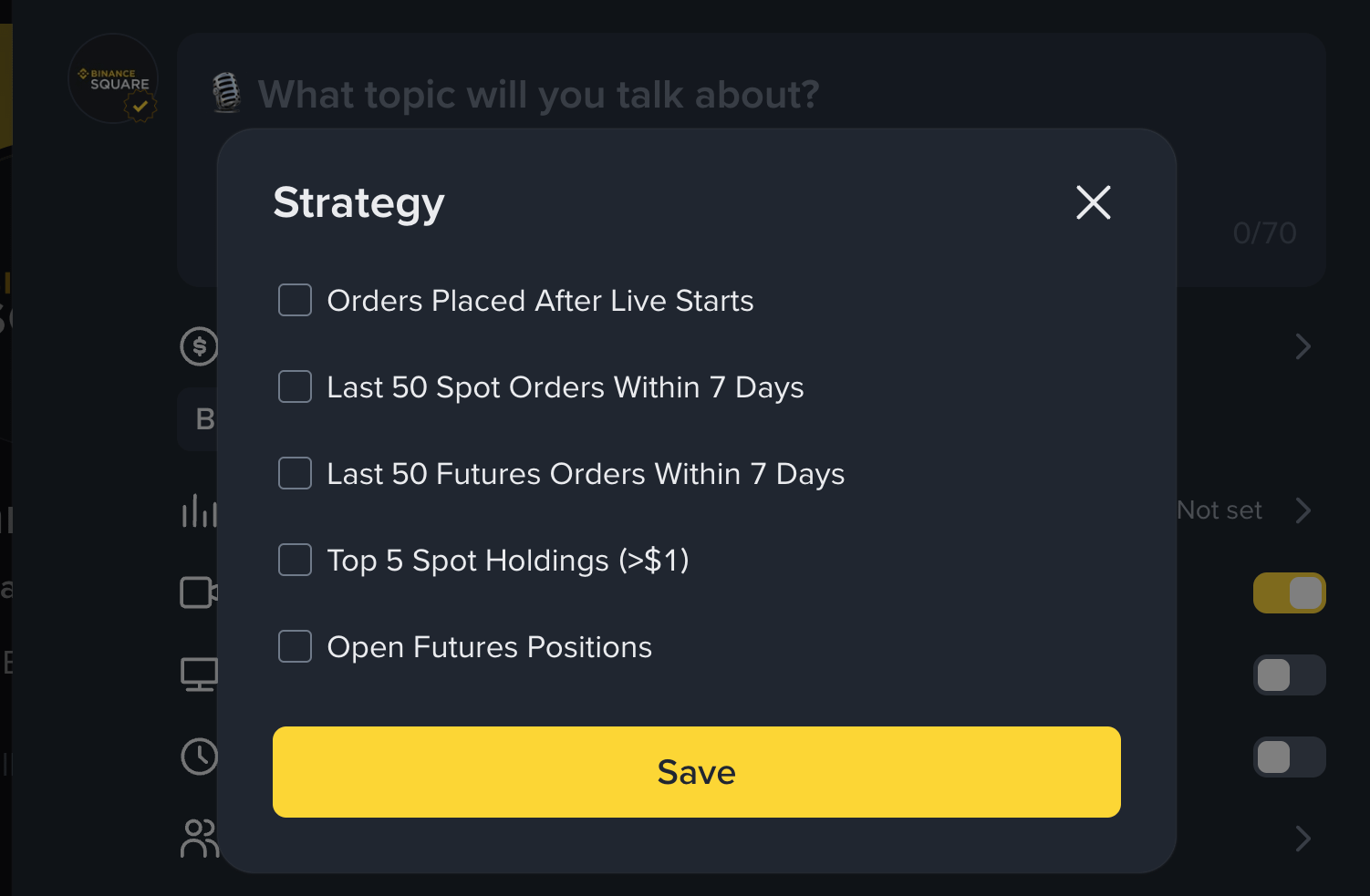 Enable the Strategy feature to share your trade history with your users. You can choose to share orders placed during live sessions, the last 50 spot or futures orders within the past 7 days, top holdings, and your open futures positions.
