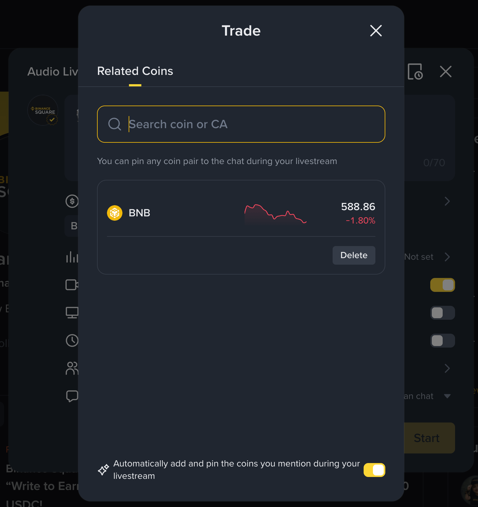 Search by token name or contract address (CA) to pin tokens in your live room.