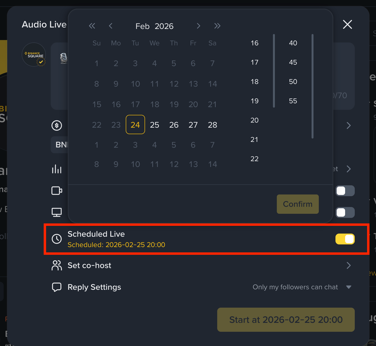 You can schedule up to 1 Audio Live ahead of the next 14 days(according to the time of your computer system), if you need to set up multiple Lives, please contact Square team.