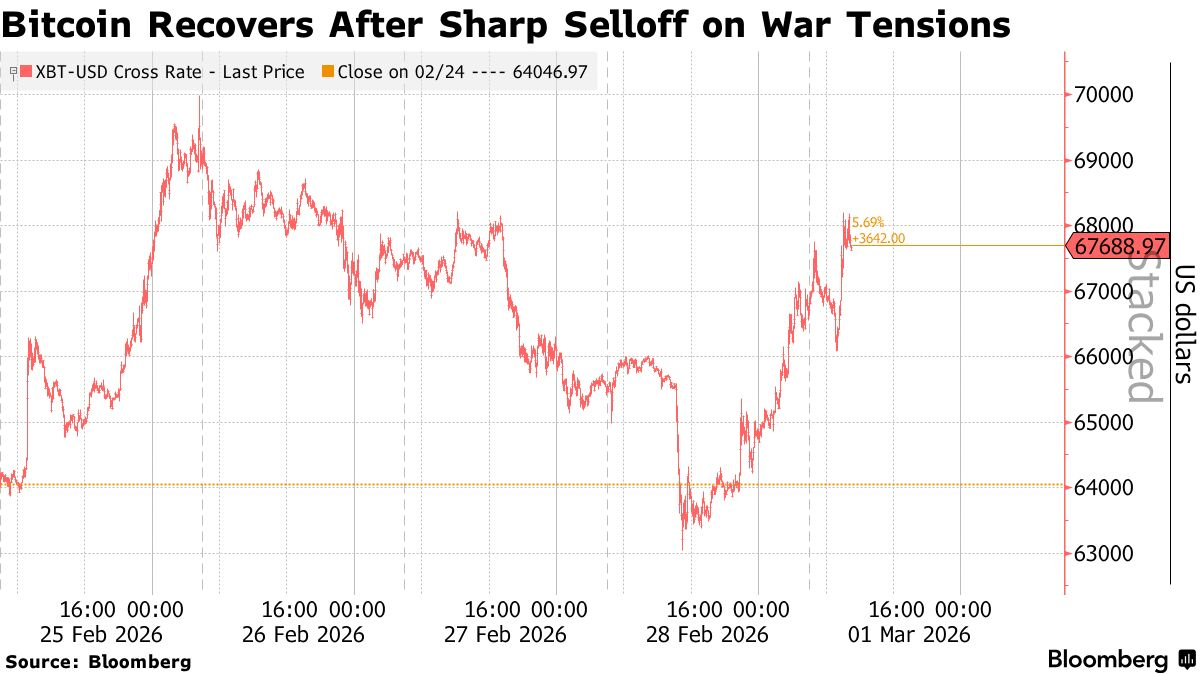 Crypto markets, which trade 24/7, were rattled in the hours after the bombing began. Iran launched counterstrikes on multiple locations — including Israel, Qatar, the United Arab Emirates and Bahrain — and threatened more against US linked bases in Iraq. Yet digital assets started to recover throughout the day, with Bitcoin moving sharply higher after initial reports that Iranian leader Ayatollah Ali Khamenei was dead.