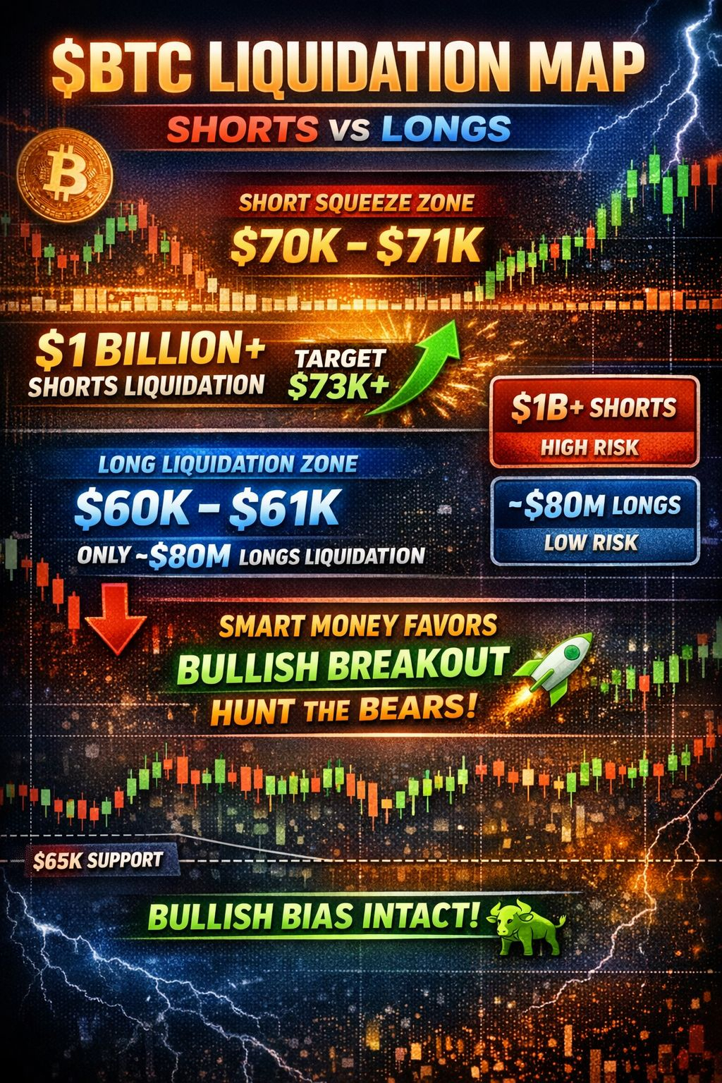 The liquidation map shows a massive short trap above $70K.