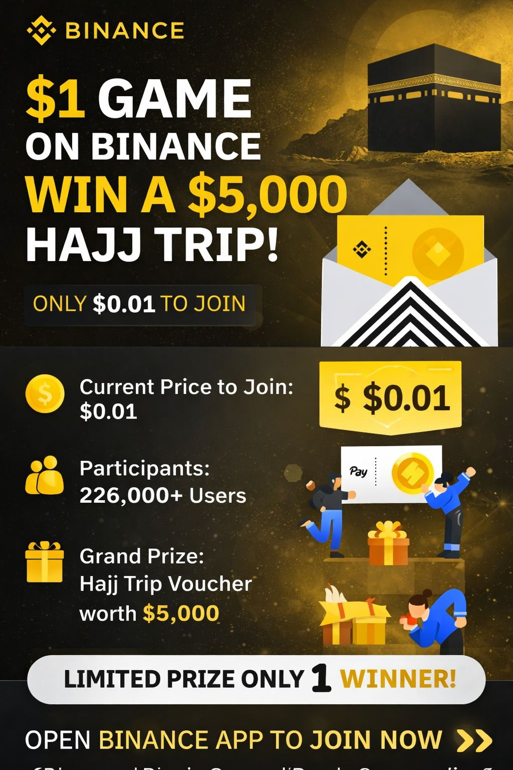 An exciting campaign is live on Binance where users can participate in the $1 Game for a chance to win a Hajj trip worth $5,000.