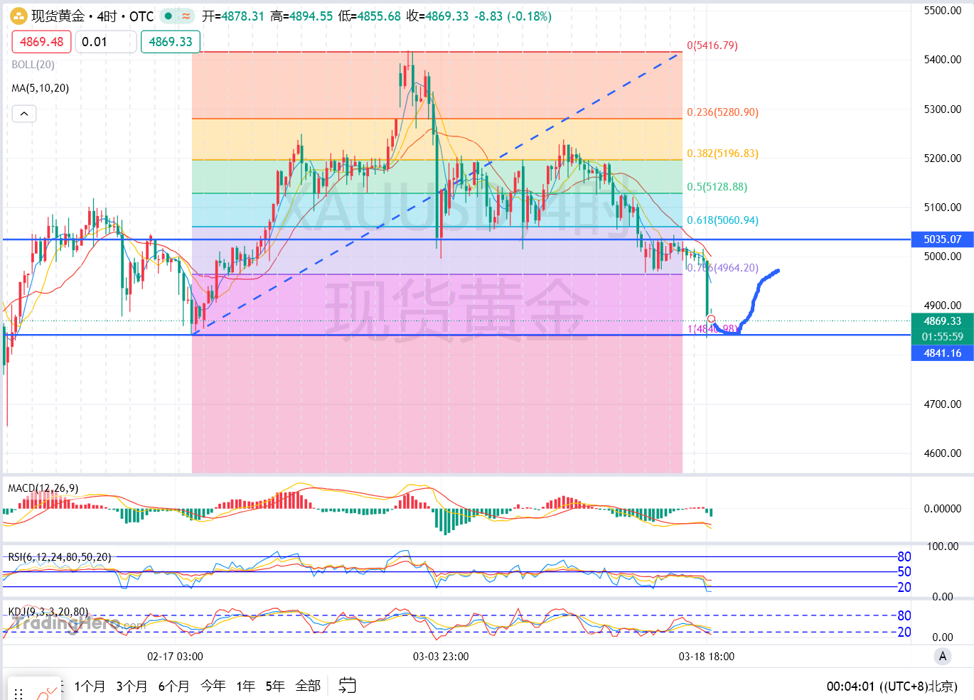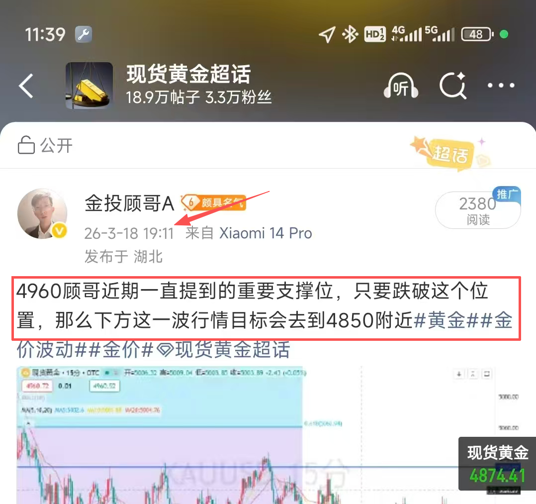 In the evening, gold plummeted sharply, breaking through the 4960 support and directly hitting the bottom support near 4850. When gold broke, Gu Ge indicated that gold would drop to 4850, which has been announced across the internet.