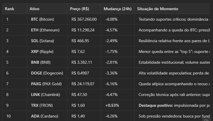 Bitcoin leads the volume, but cannot sustain the previous price level, trading at R$ 367,260. The drop of 4.08% signals that investors are in "risk-off" mode. Ethereum suffers a slightly larger penalty (-4.57%), common in retracement moments where ETH tends to have a higher beta than BTC.
