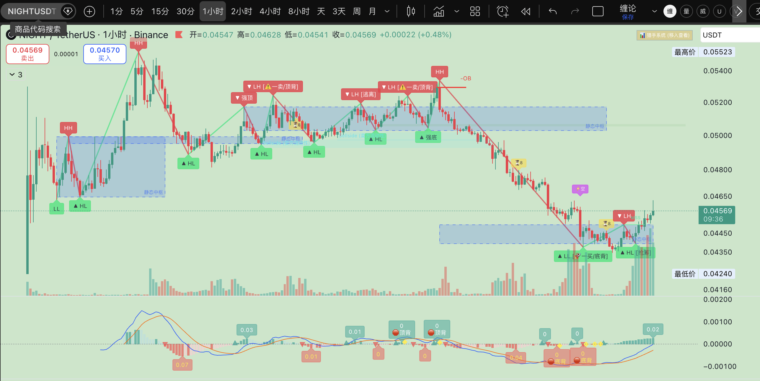 在缠论的坐标系里,最完美的入场点往往诞生在最绝望的时刻。NIGHT 在 0.04346 附近打出的 “LL [一买/底背]” 绿色标签,不只是一个价格点,它是空头动能彻底枯竭的里程碑。