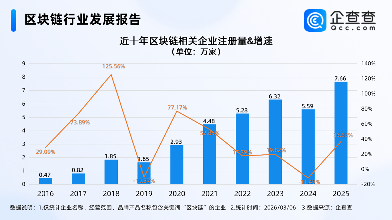 同时,企查查数据显示,截至3月6日,国内现存区块链相关企业29.68万家,2025年新注册7.66万家,同比增长36.83%,创近十年峰值。存量方面,区块链相关企业注册资本以轻量级为主,注册资本在200万元以下的区块链相关企业占比超六成;从地区分布看,华南地区占比35.26%,华东地区占比26.74%,呈现明显集聚特征。