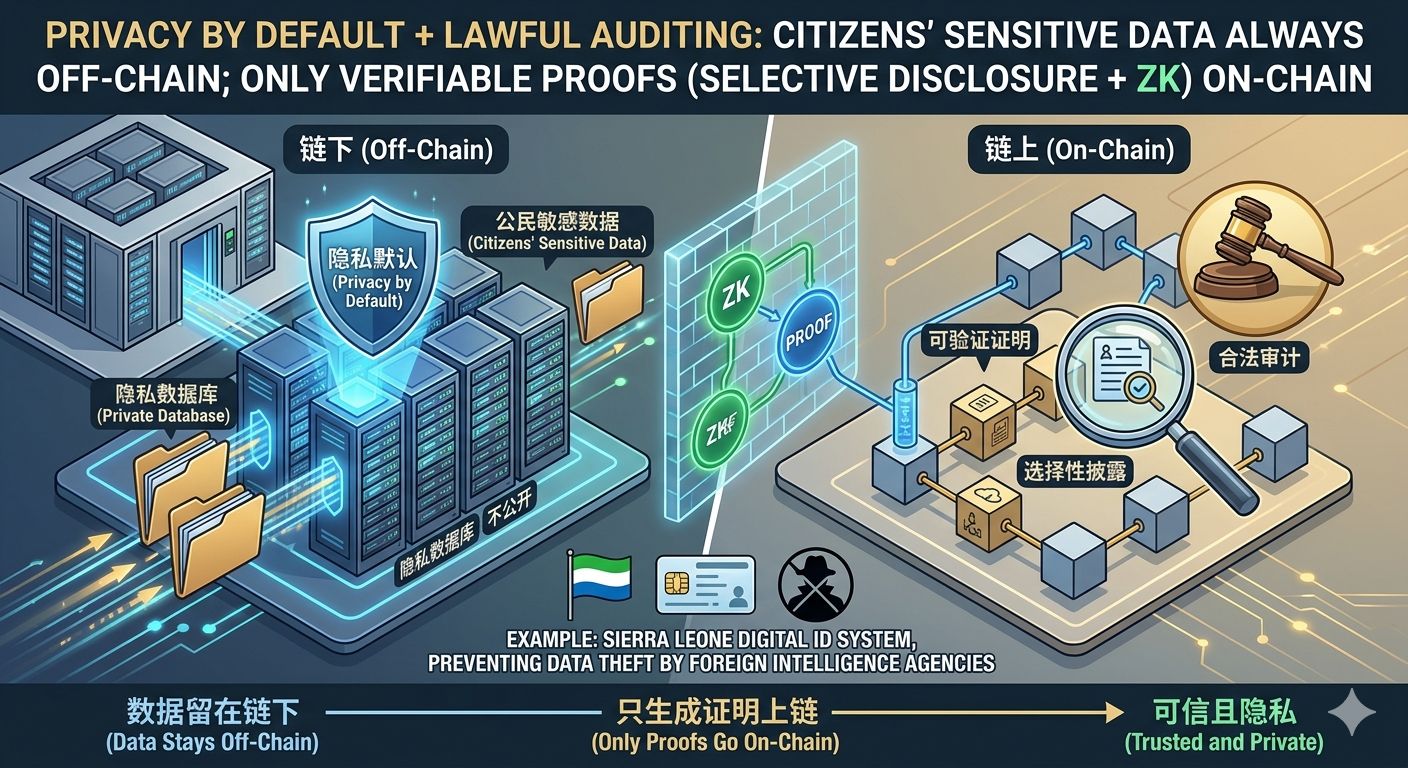 Privacy by default + legal audit: citizens' sensitive data remains off-chain, while only verifiable proofs go on-chain (selective disclosure + ZK). Sierra Leone has used it to build a digital ID system to prevent data from being stolen by foreign intelligence agencies;