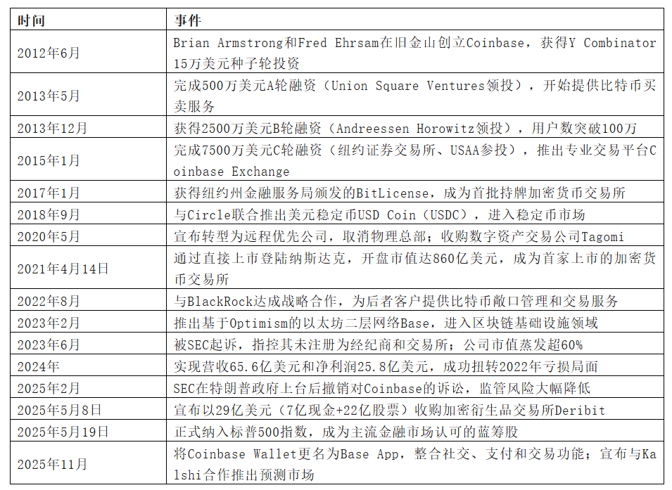 Coinbase是一家总部位于美国旧金山的加密货币交易平台,由Brian Armstrong和Fred Ehrsam于2012年6月创立。作为全球最大的比特币托管机构和美国最大的加密货币交易所,Coinbase在100多个国家和地区运营,服务超过1.08亿用户,管理着价值5160亿美元的数字资产,包括全球12%的比特币存量和11%的质押以太坊。公司于2021年4月14日通过直接上市方式在纳斯达克挂牌(代码:COIN),成为首家在美国主流证券交易所上市的加密货币交易平台,并于2025年5月19日被纳入标普500指数成分股。