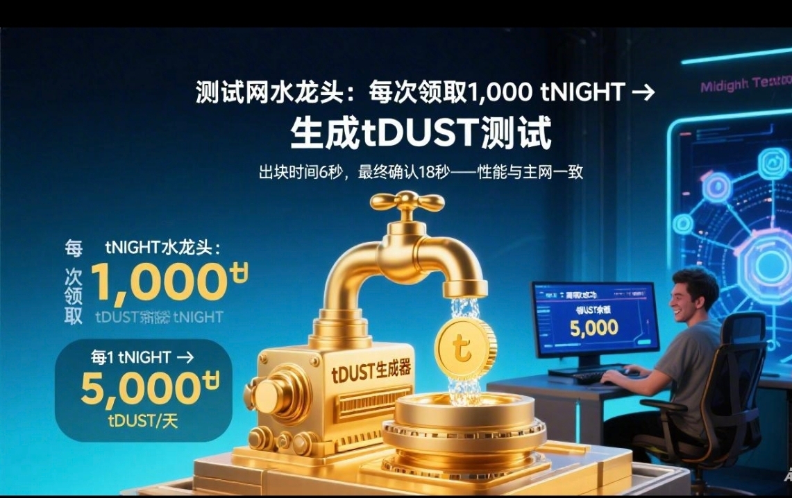 According to the information I found, testnet users can receive tNIGHT from the faucet, about 1000 tNIGHT can be received each time. This is used to generate tDUST for testing. Of course, this faucet is also limited in flow protection, and the same address needs to wait several hours before receiving again, as it is only in the testing phase.