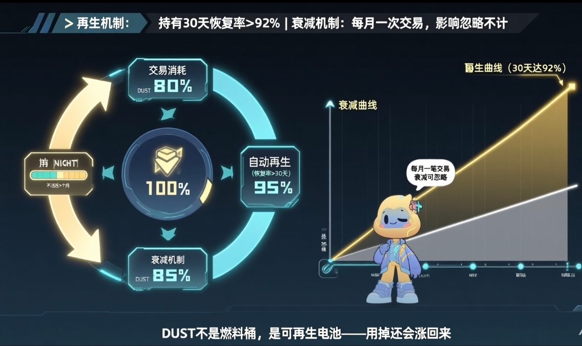 First, the regeneration mechanism. After users consume DUST, they only need to continue holding NIGHT, and the corresponding DUST will regenerate until it reaches the generation limit. According to the actual test data I found, as long as users hold $NIGHT tokens for more than 30 days, the recovery rate of the DUST balance is basically stable at over 92%.