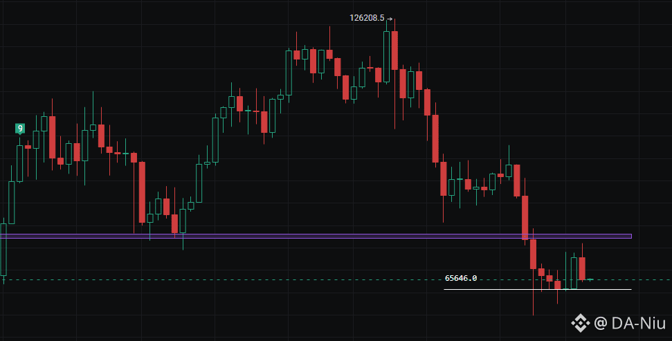 上周我也提过,本周大概率继续走弱,价格还会进一步下行。目前最关键的支撑,在周线开盘价 66000 附近,这里同时也是日线趋势线位置,大概率会有短暂反弹或震荡整理。但只要市场没有走出强势反转信号,这个位置最终还是容易被跌破,一旦破位,就会开启第三段下跌行情,大概率会走出一波快速下行,直奔前低 60000 下方。跌破之后的行情,我认为至少需要数月时间震荡修复,这个阶段大概率是主力吸筹周期,会伴随反复测试、插针洗盘等动作。在市场没有走出明确结构之前,不会轻易抄底;一旦信号出现,我们会提前布局。