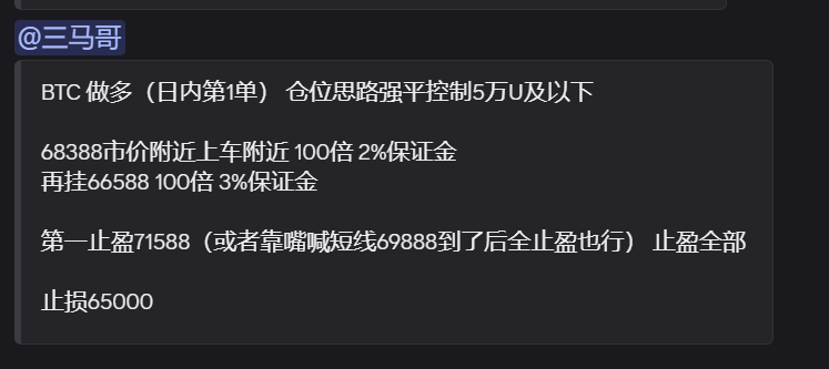 三马哥:BTC 68388激进多(100倍),止盈71588,止损65000。