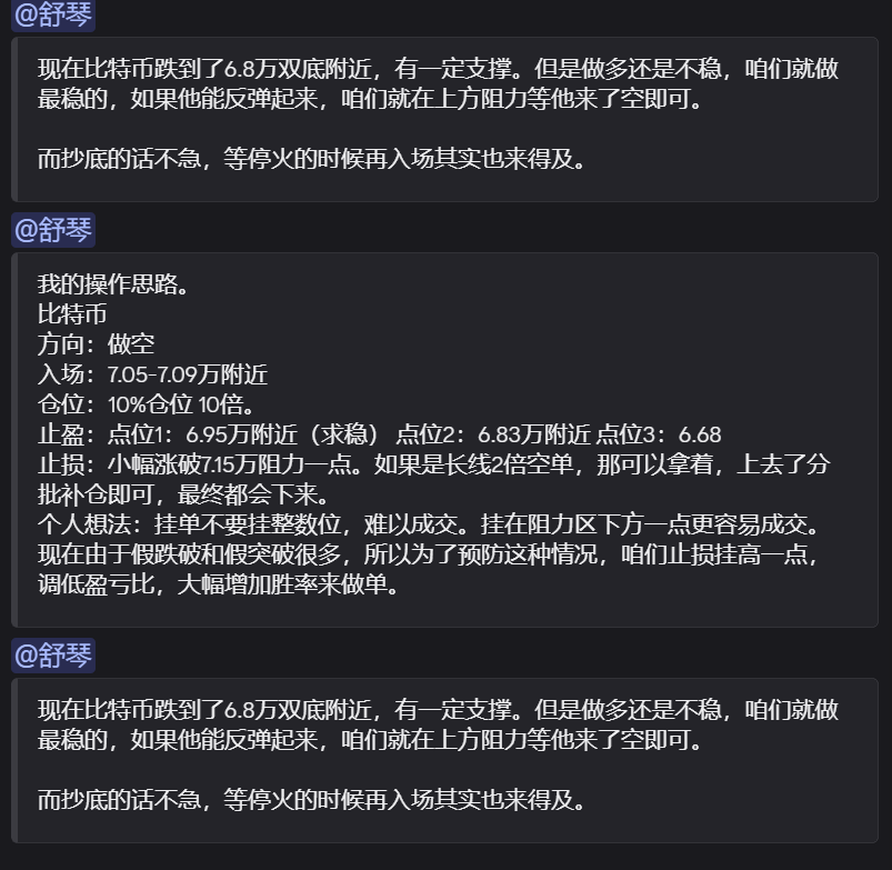 舒琴:BTC 6.8w双底有支撑,但做多不稳,上方7.05-7.09w等反弹再空;止盈6.68-6.95w(10%仓10倍)