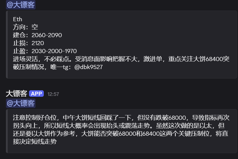 大镖客:ETH 2060-2090空,止盈1970-2000;关注BTC 68400突破。
