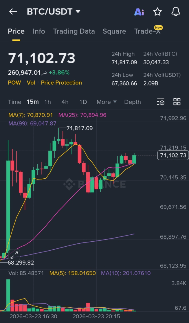 Over the past 24 hours, Bitcoin reached a high near $71,817 and maintained solid support above $70,400. This price action indicates that bulls are actively defending key levels, preventing deeper pullbacks. The moving averages (MA7 and MA25) are converging, suggesting consolidation before a potential breakout. Meanwhile, the MA99 remains significantly lower, reinforcing the long-term bullish structure.