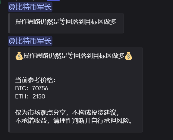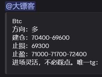 大镖客:BTC多 70400-69600,止盈71000-72400