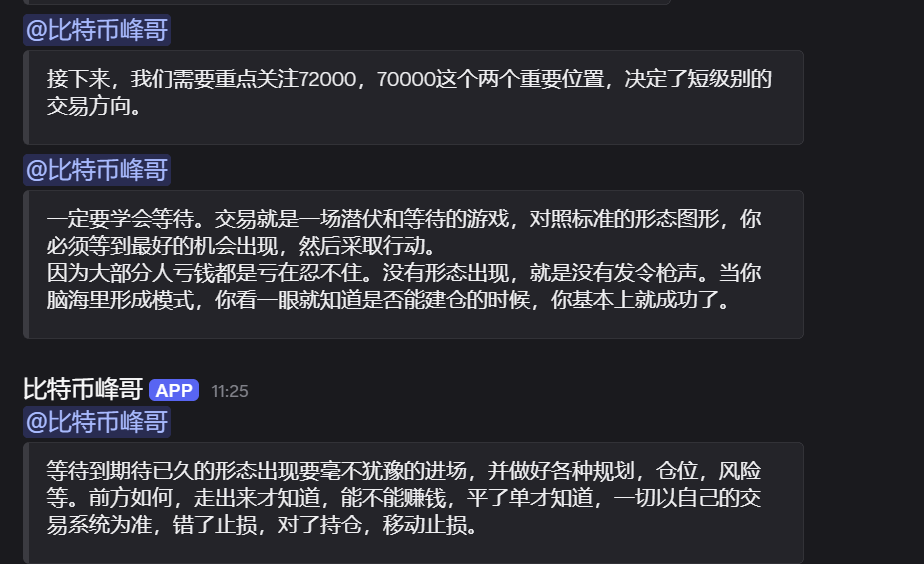 比特币峰哥:重点关注72000和70000,一定要学会等待最好形态