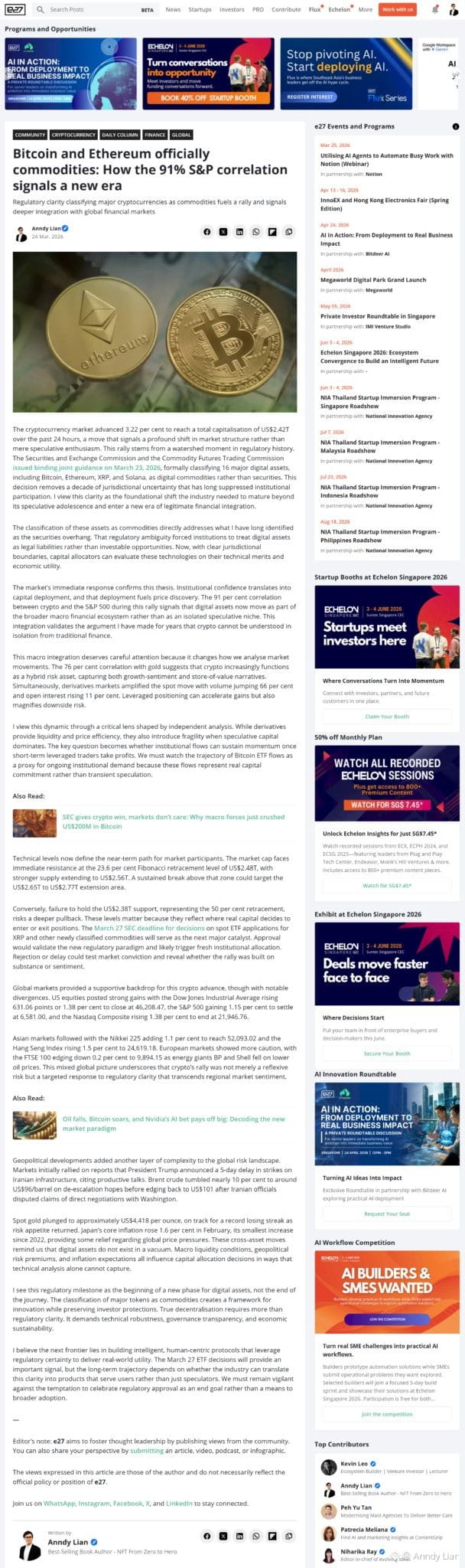 The post Bitcoin and Ethereum officially commodities: How the 91% S&P correlation signals a new era appeared first on Anndy Lian by Anndy Lian.